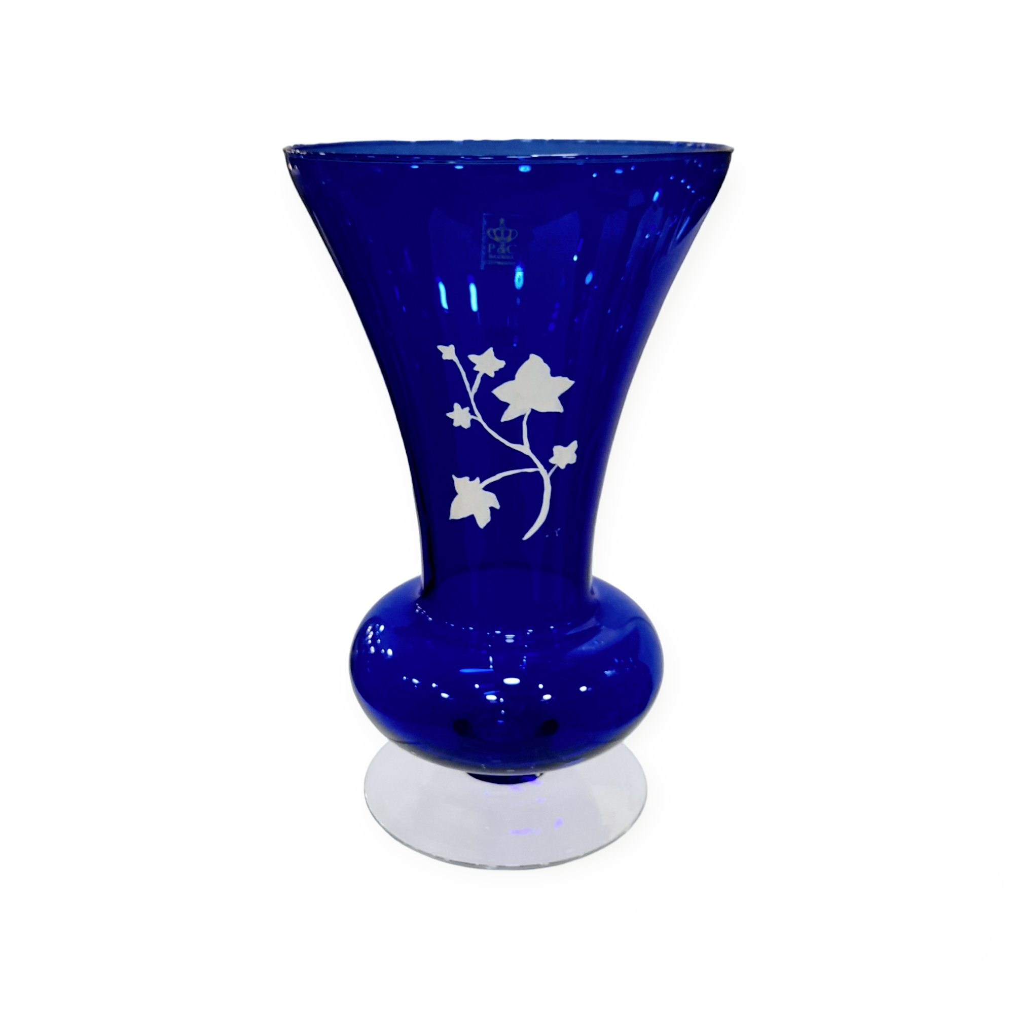 Prussian blue vase, with transparent base and handpainted white leaves on a branch