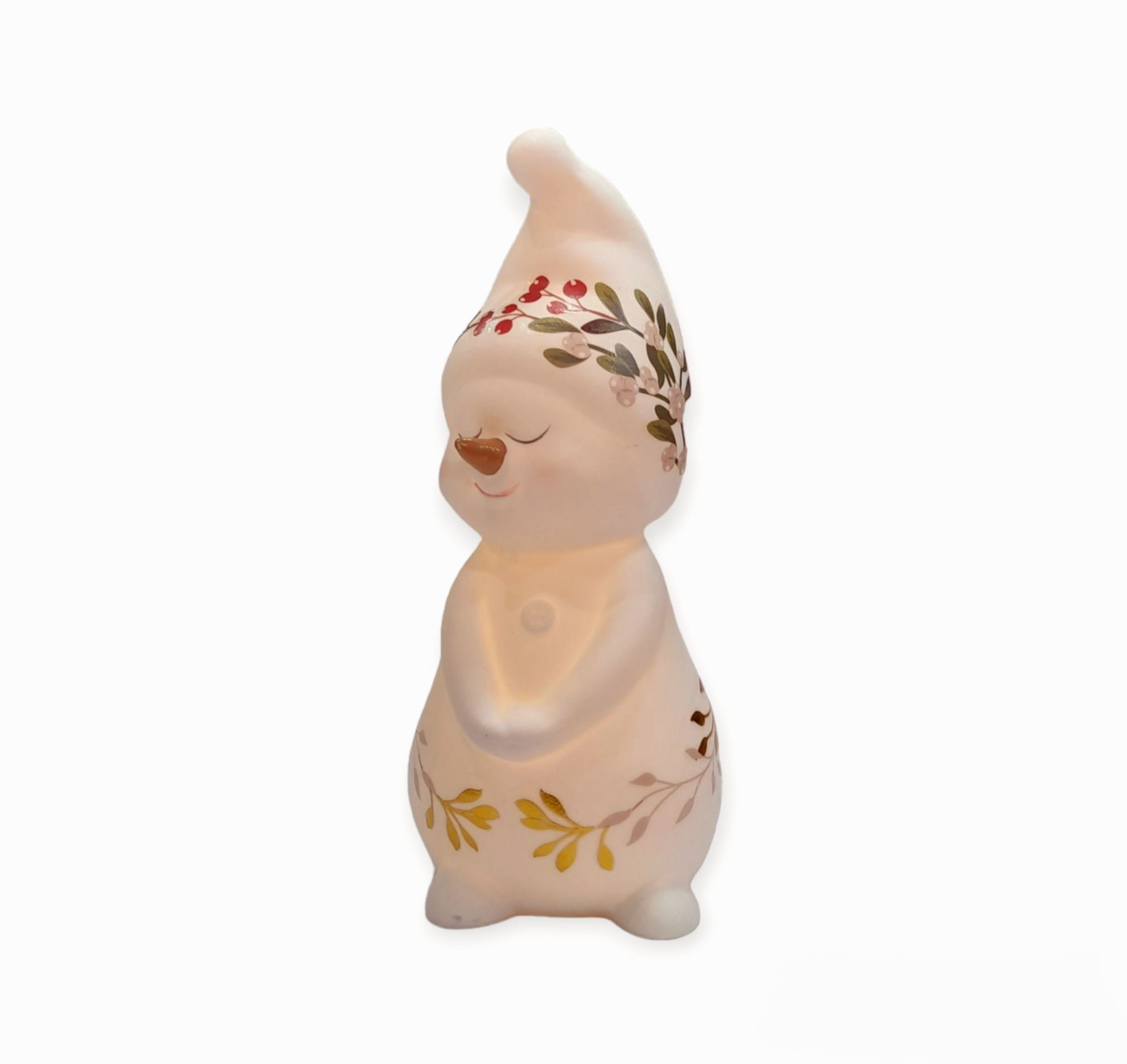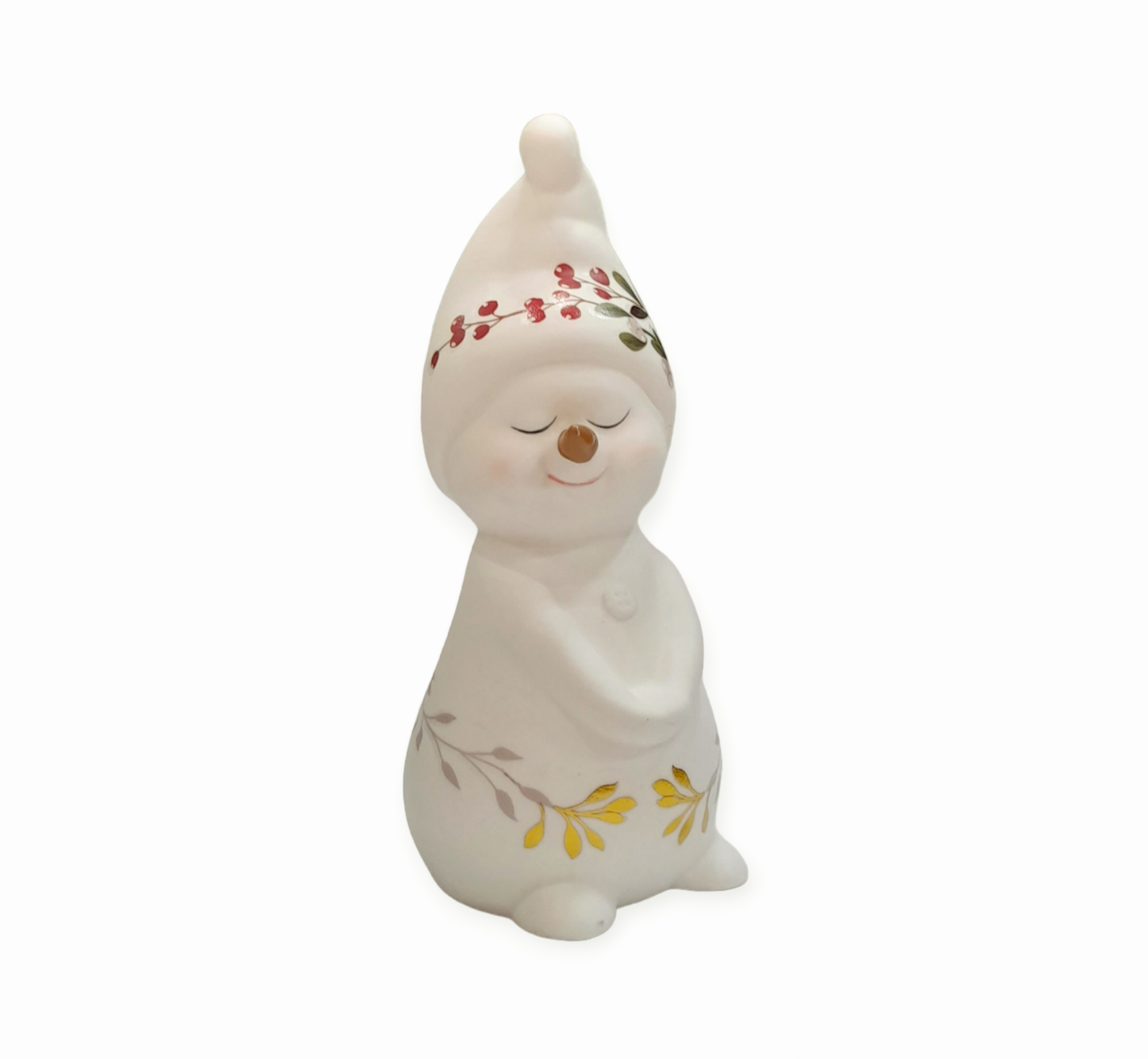 - Off-white matte porcelain snowman, decorated with mistletoe & ilex