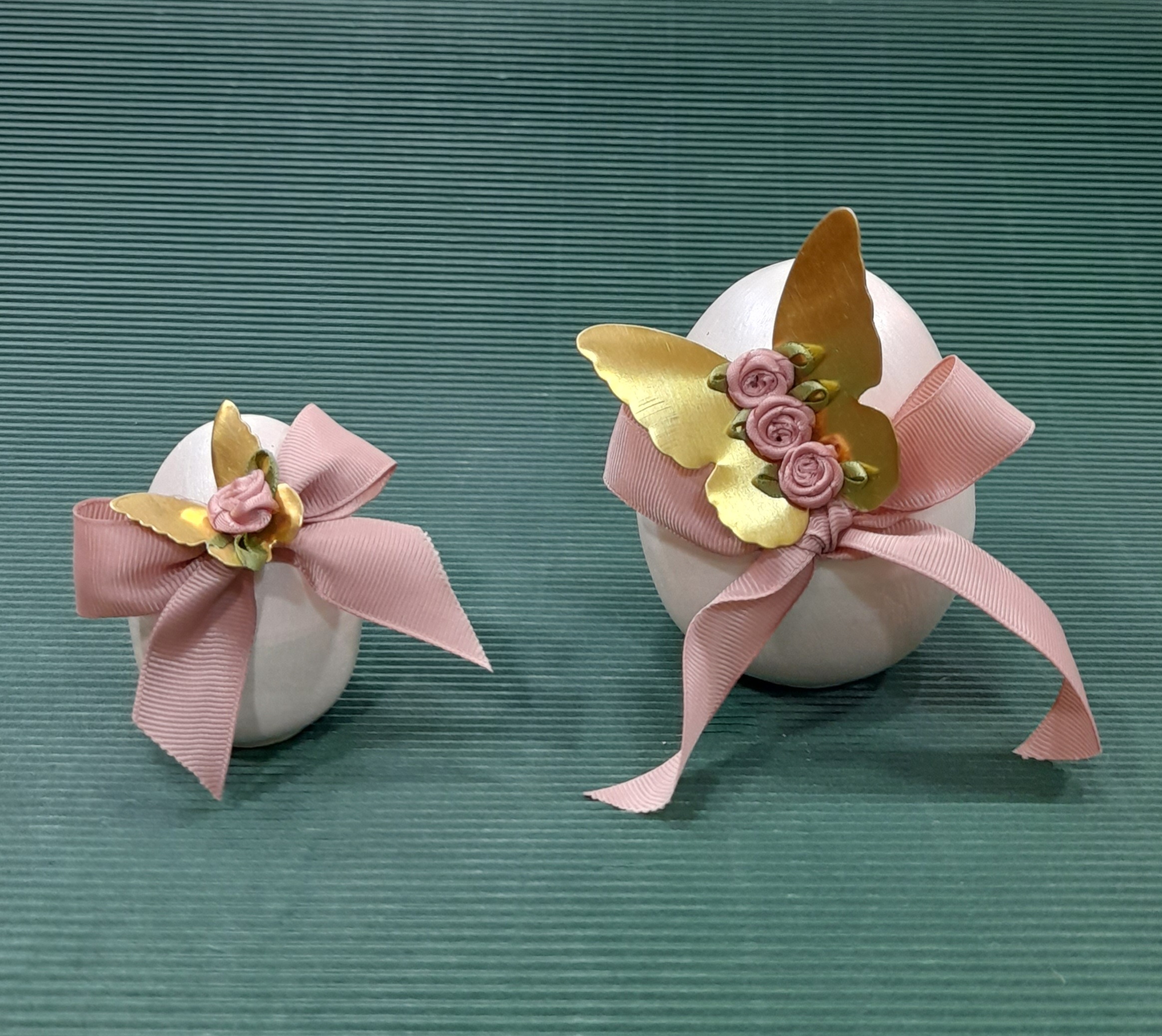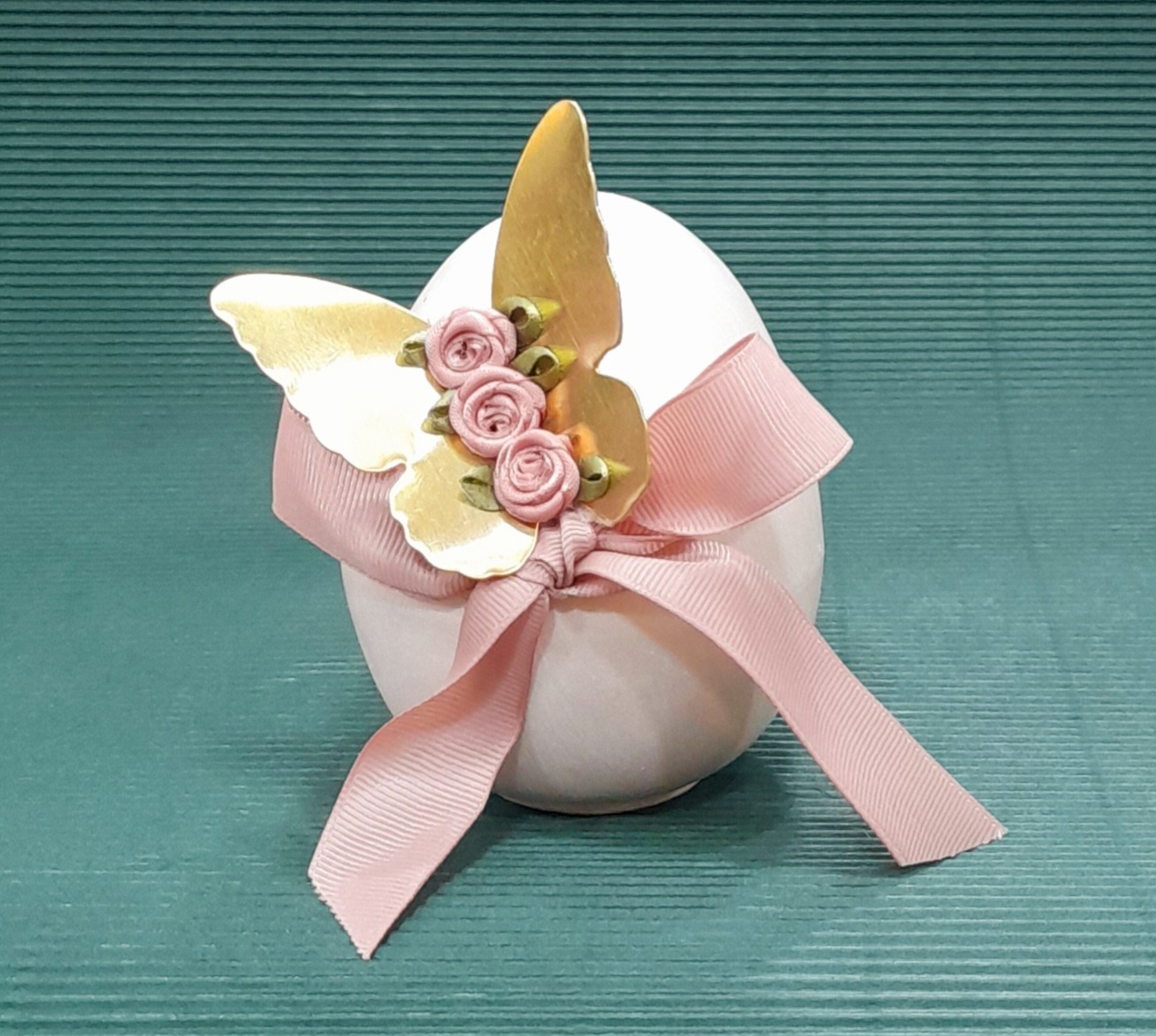 Pearl matte ceramic egg, decorated with brass butterfly & ribbons