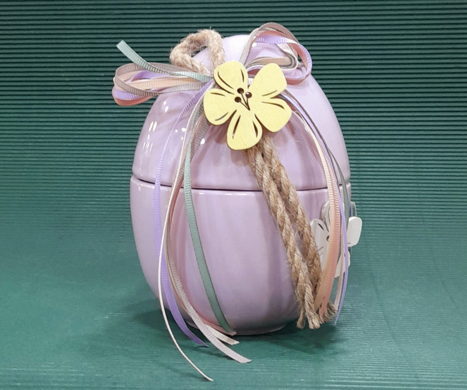 Lilac ceramic egg, decorated with wooden elements, ribbons & cord