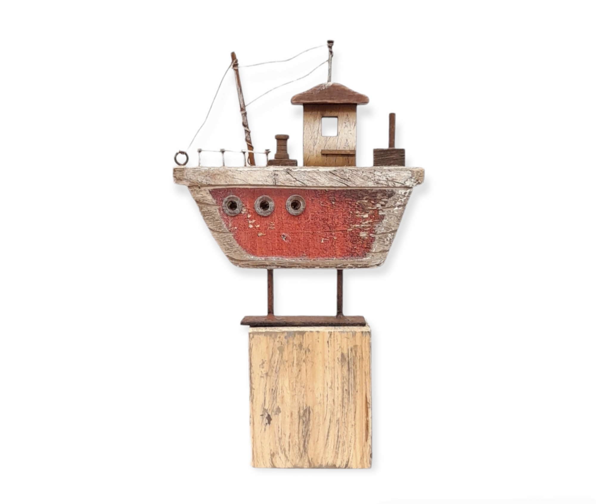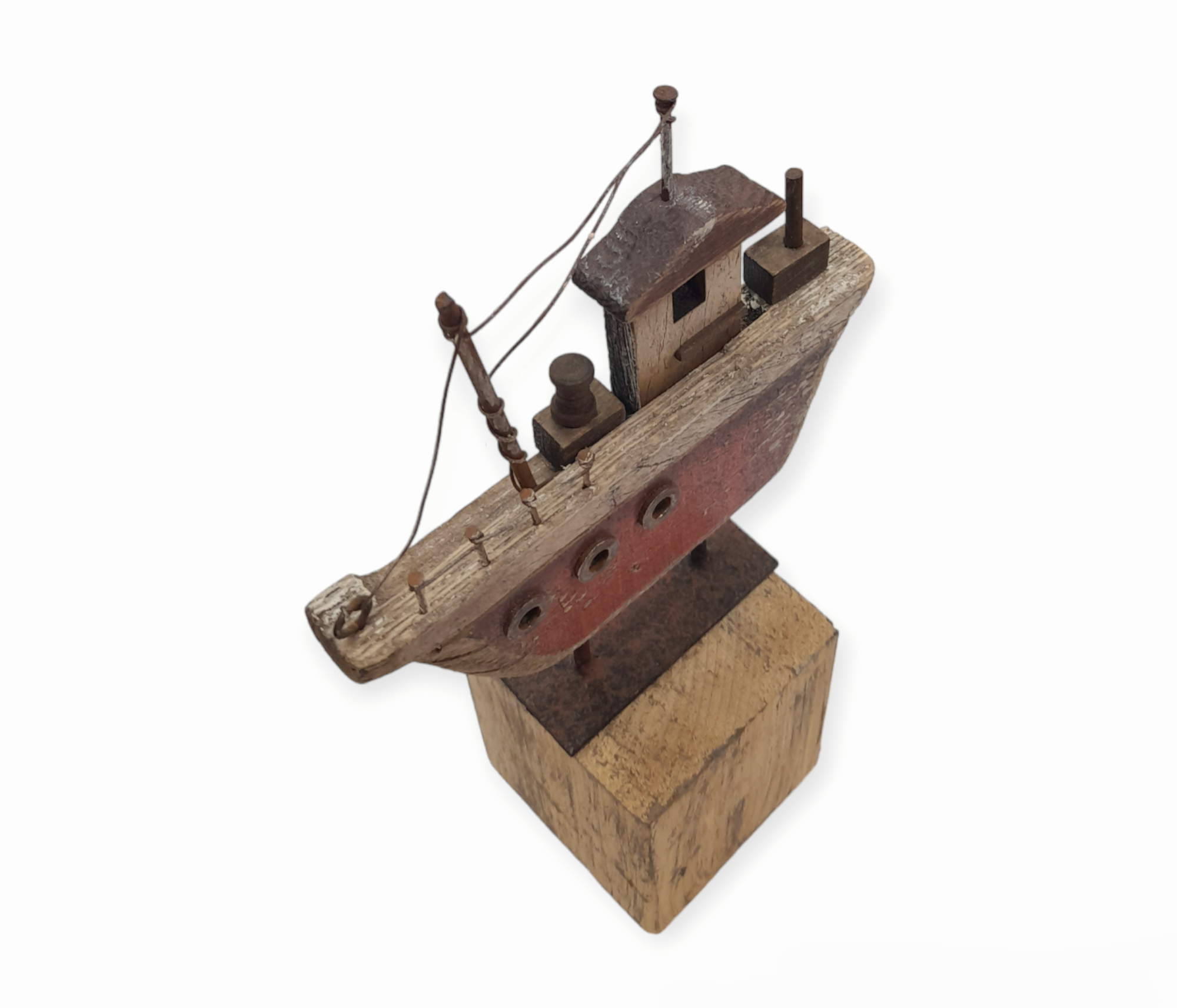 Χειροποίητο ξύλινο καράβι, τοποθετημένο πάνω σε ξύλινη βάση