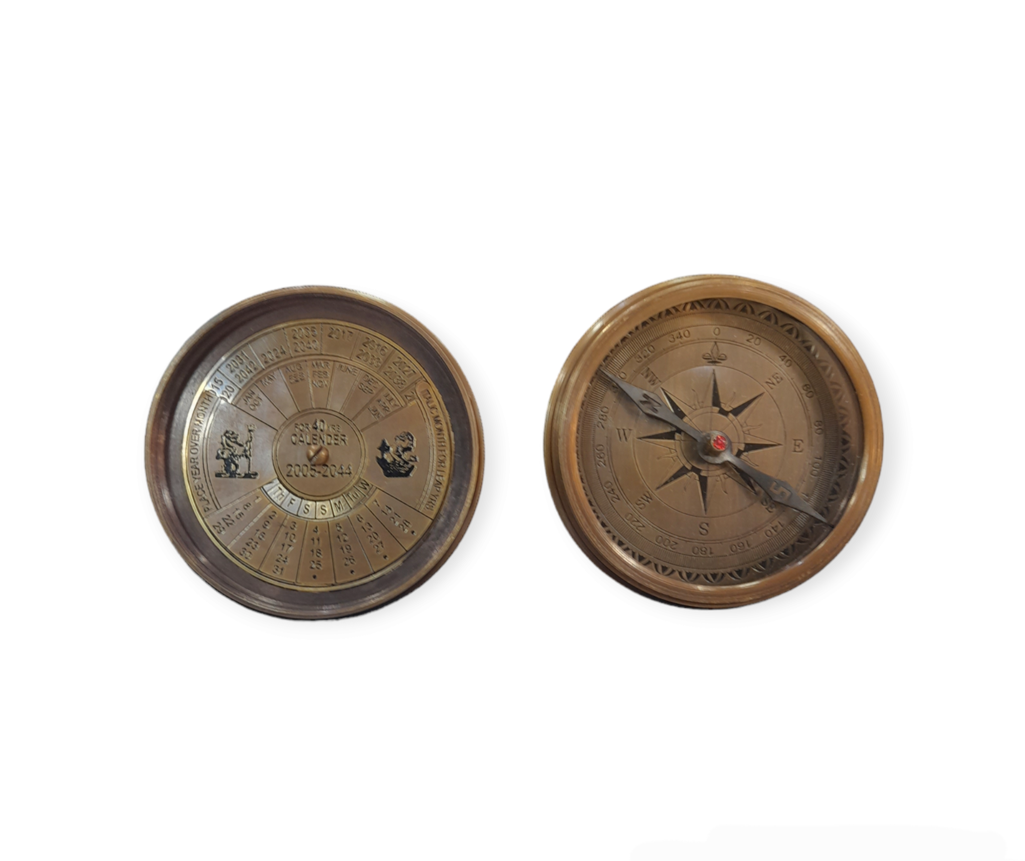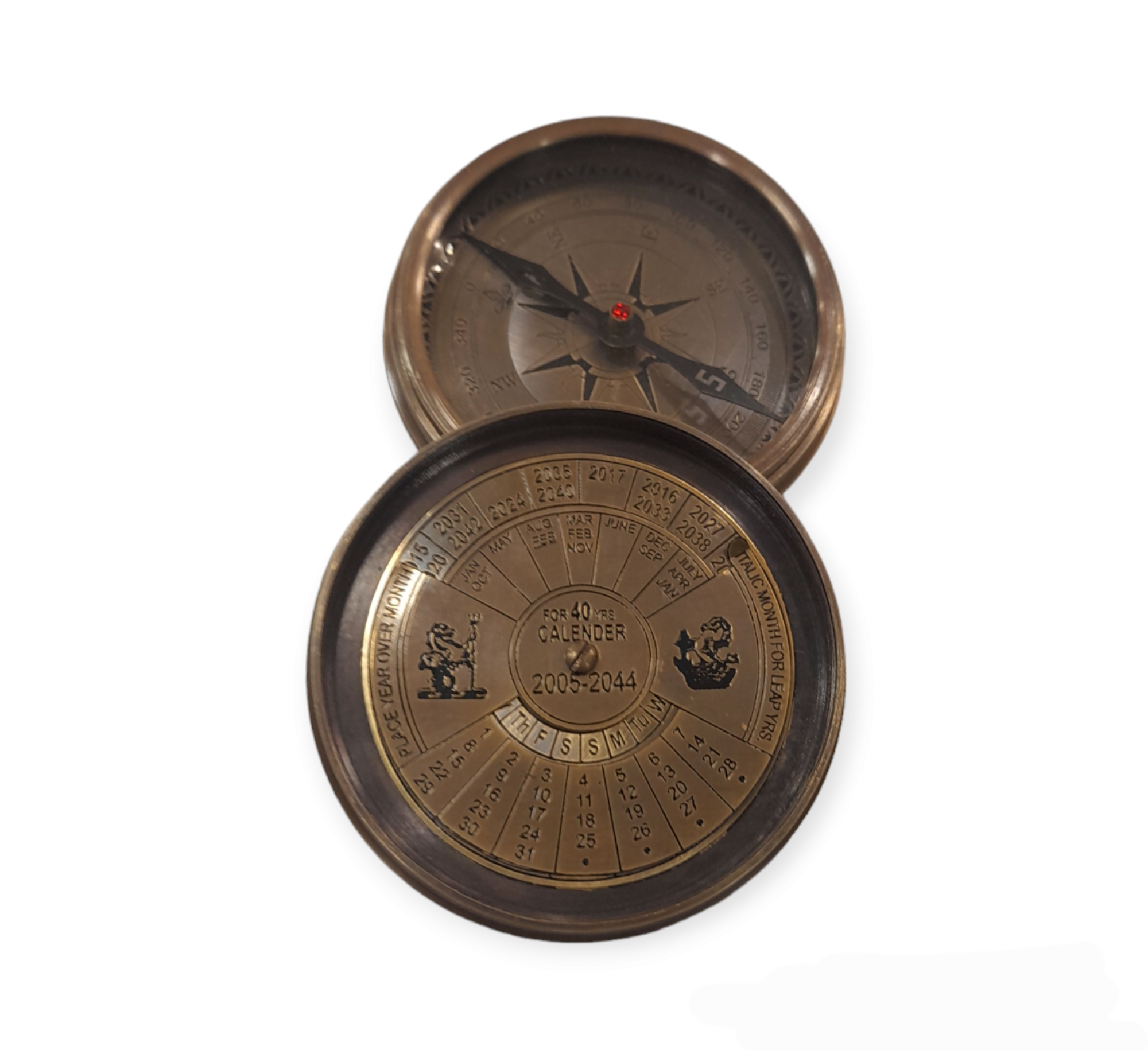 Μπρούντζινη πυξίδα με βιδωτό καπάκι, στο εσωτερικό του οποίου υπάρχει ημερολόγιο 40 ετών (2005-2044)