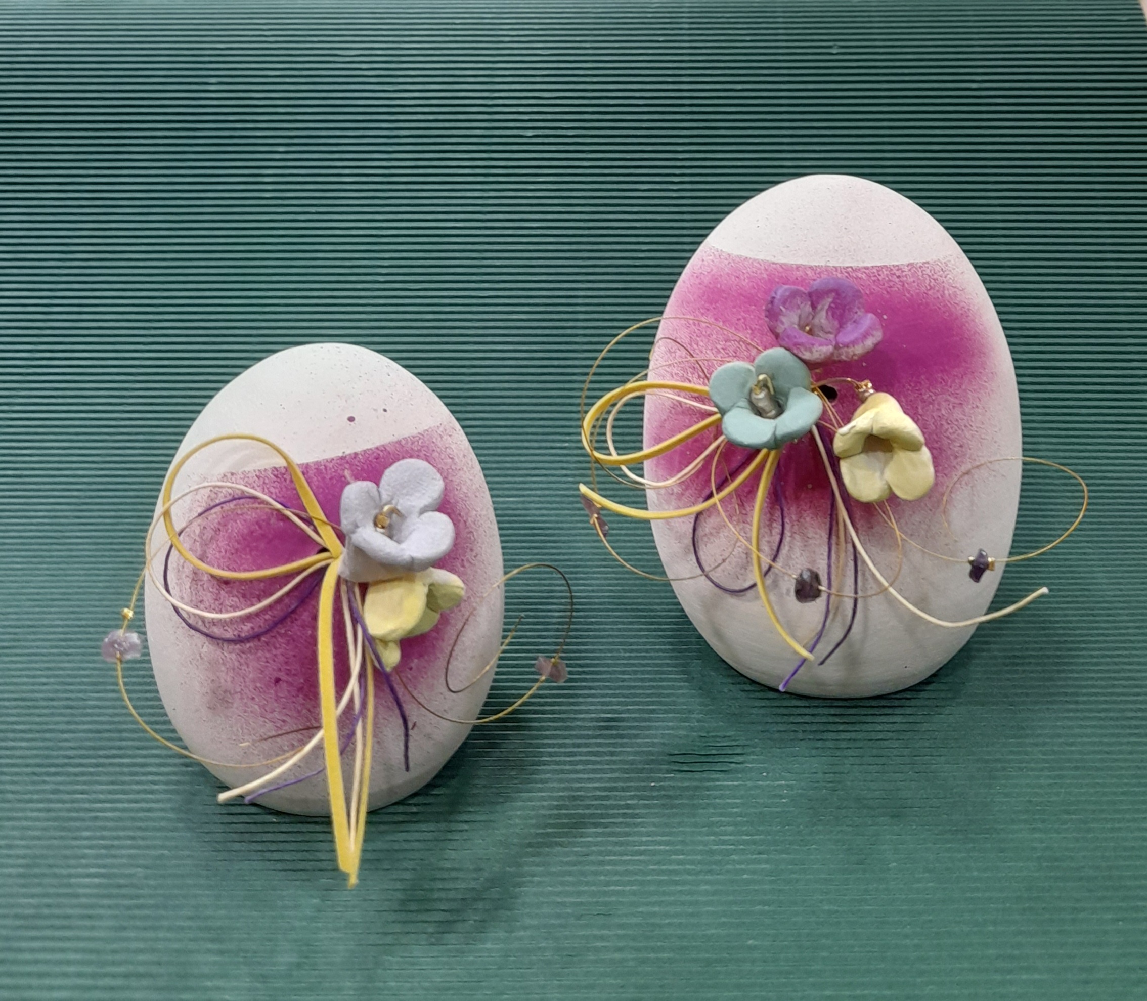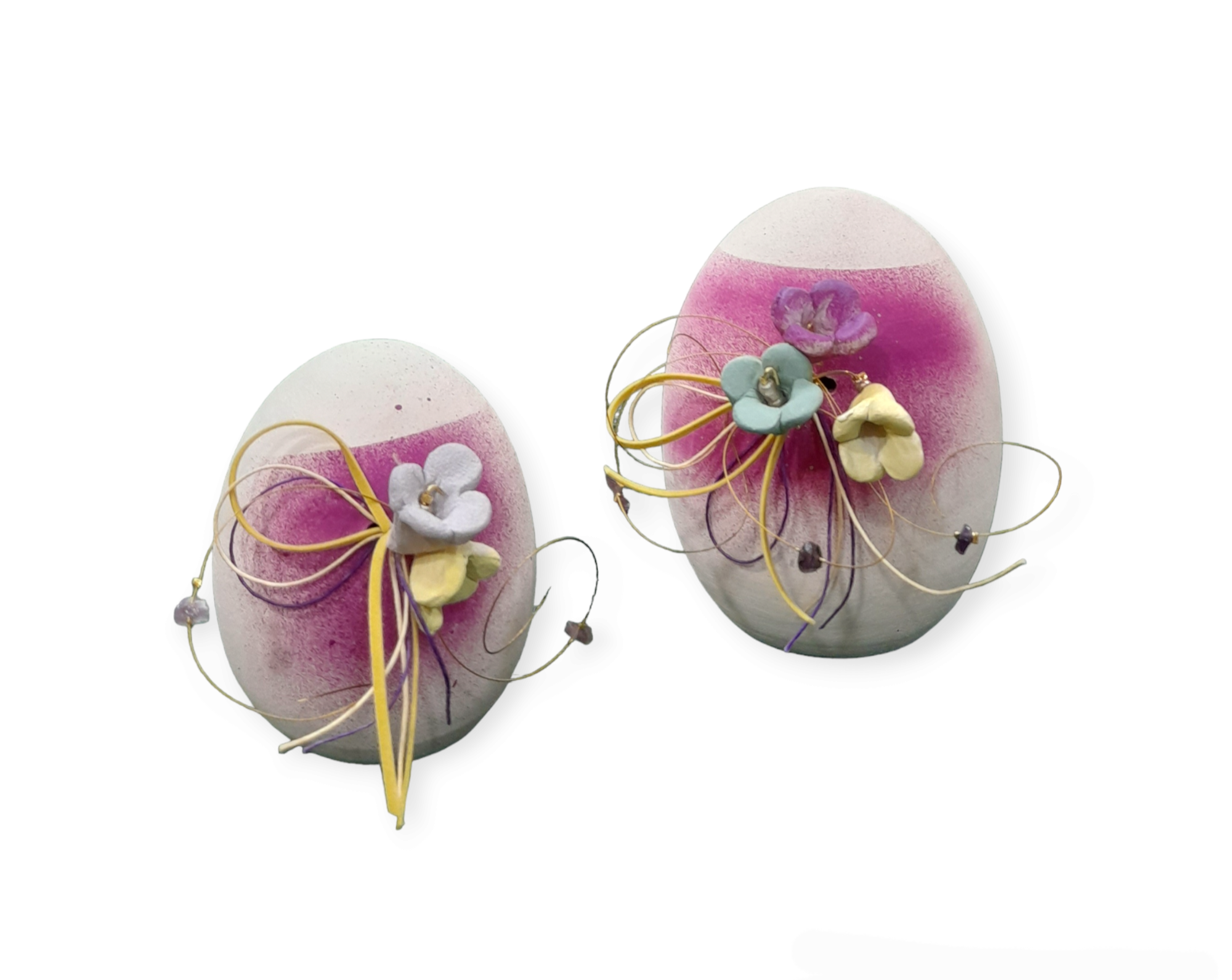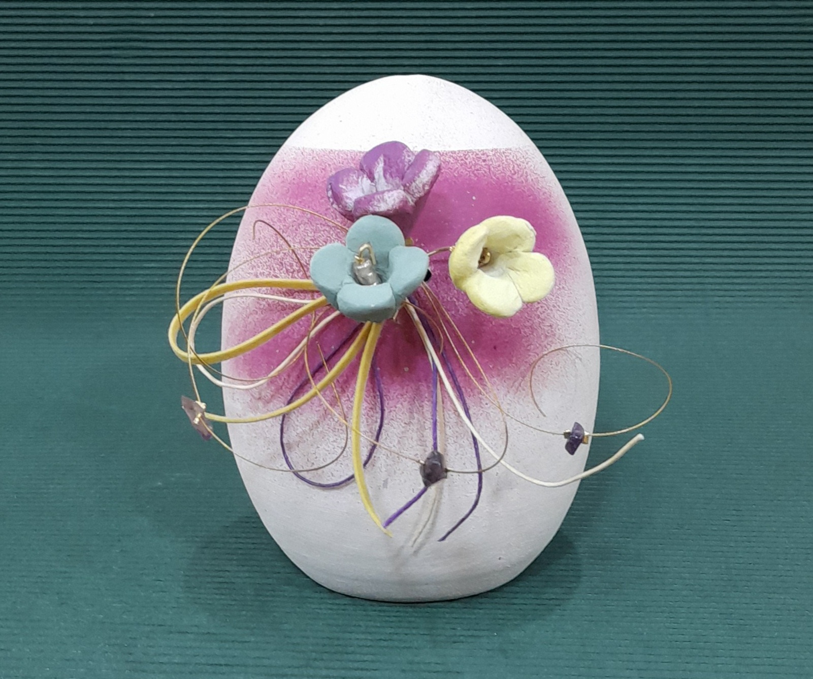 Κεραμικό αυγό, σε Off-white απόχρωση, με φούξια πιτσιλιές, διακοσμημένο με κεραμικά λουλούδια