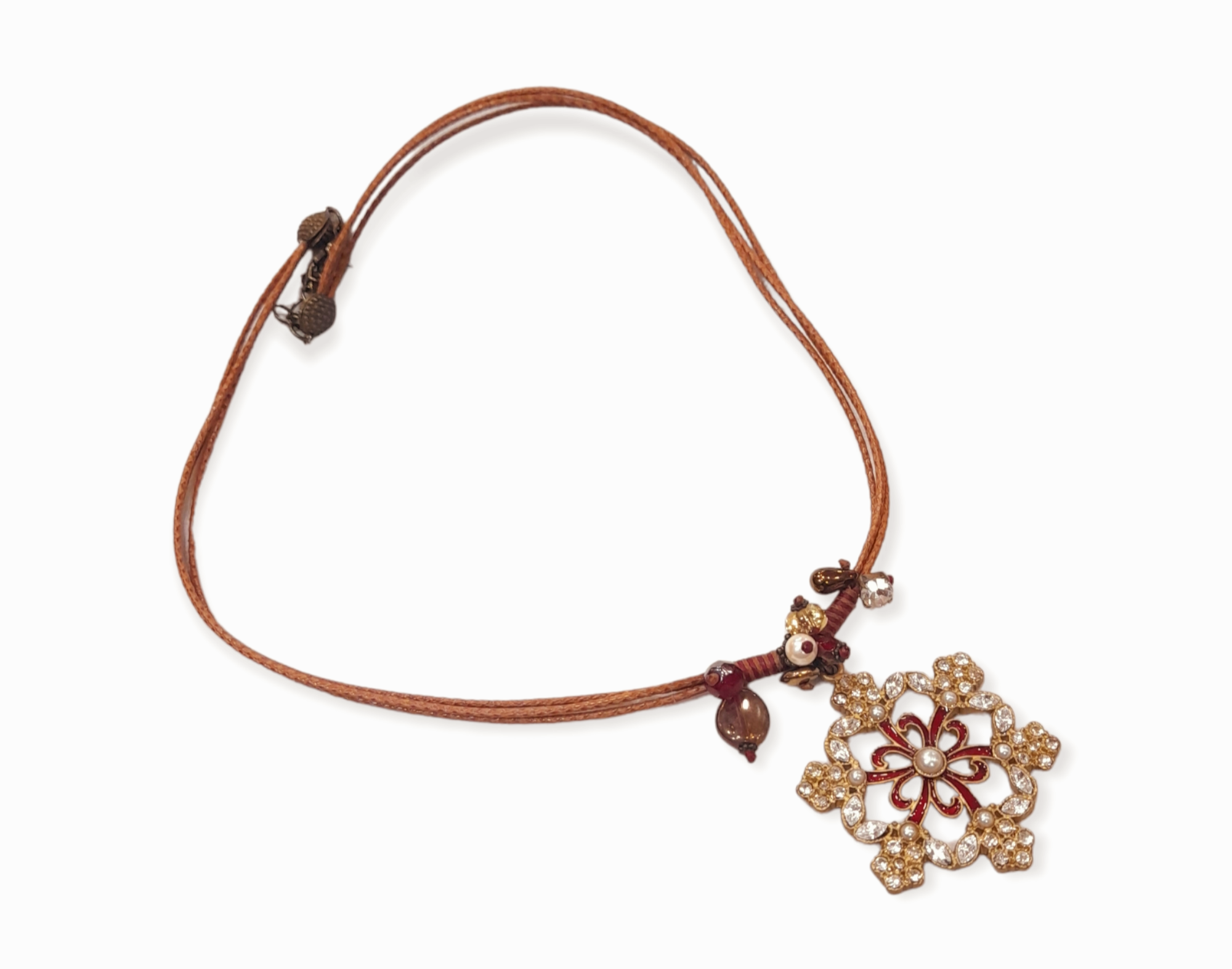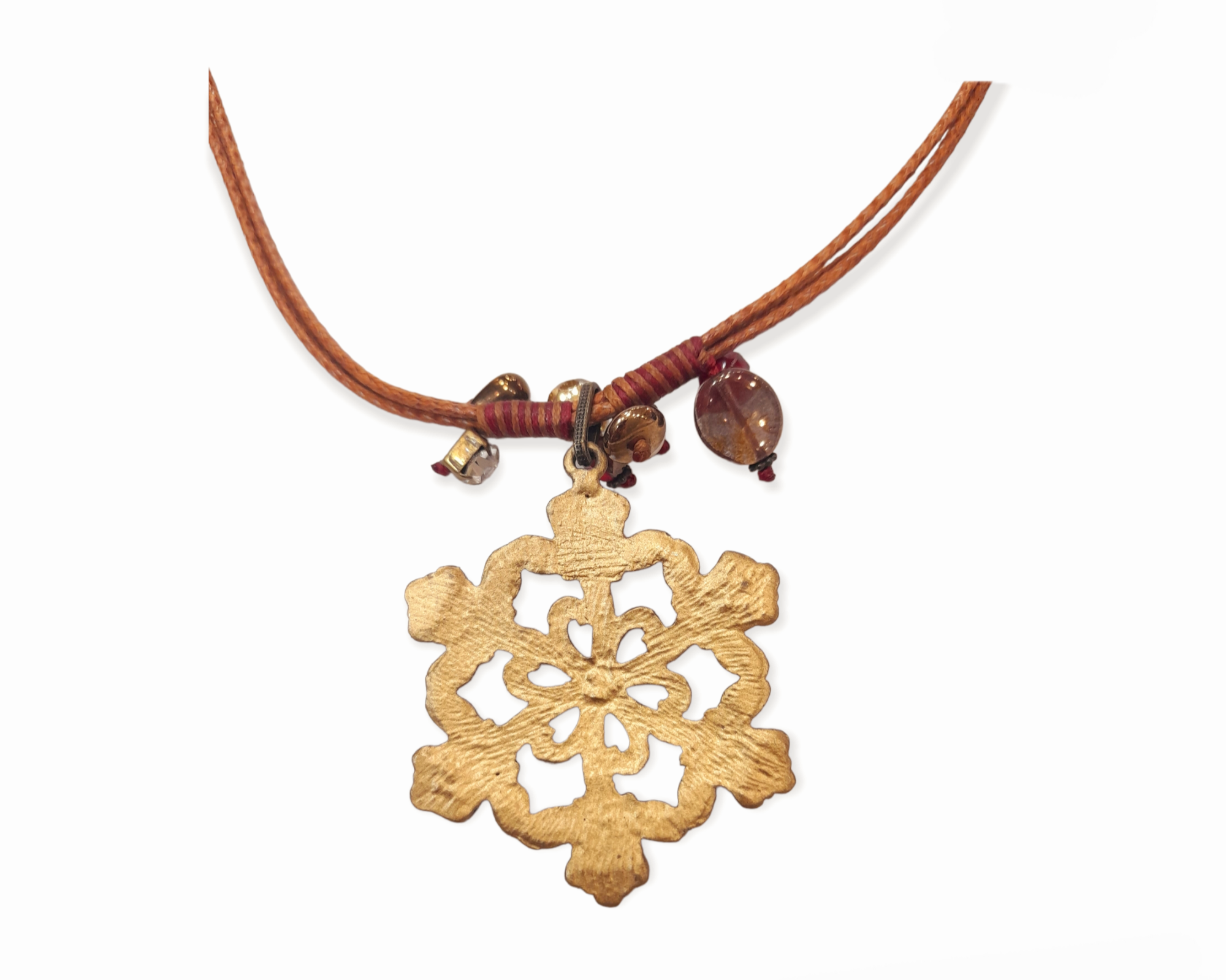 - Δεμένο σε δερμάτινο, ανοιχτό καφέ κορδόνι, με διακοσμητικά στοιχεία.